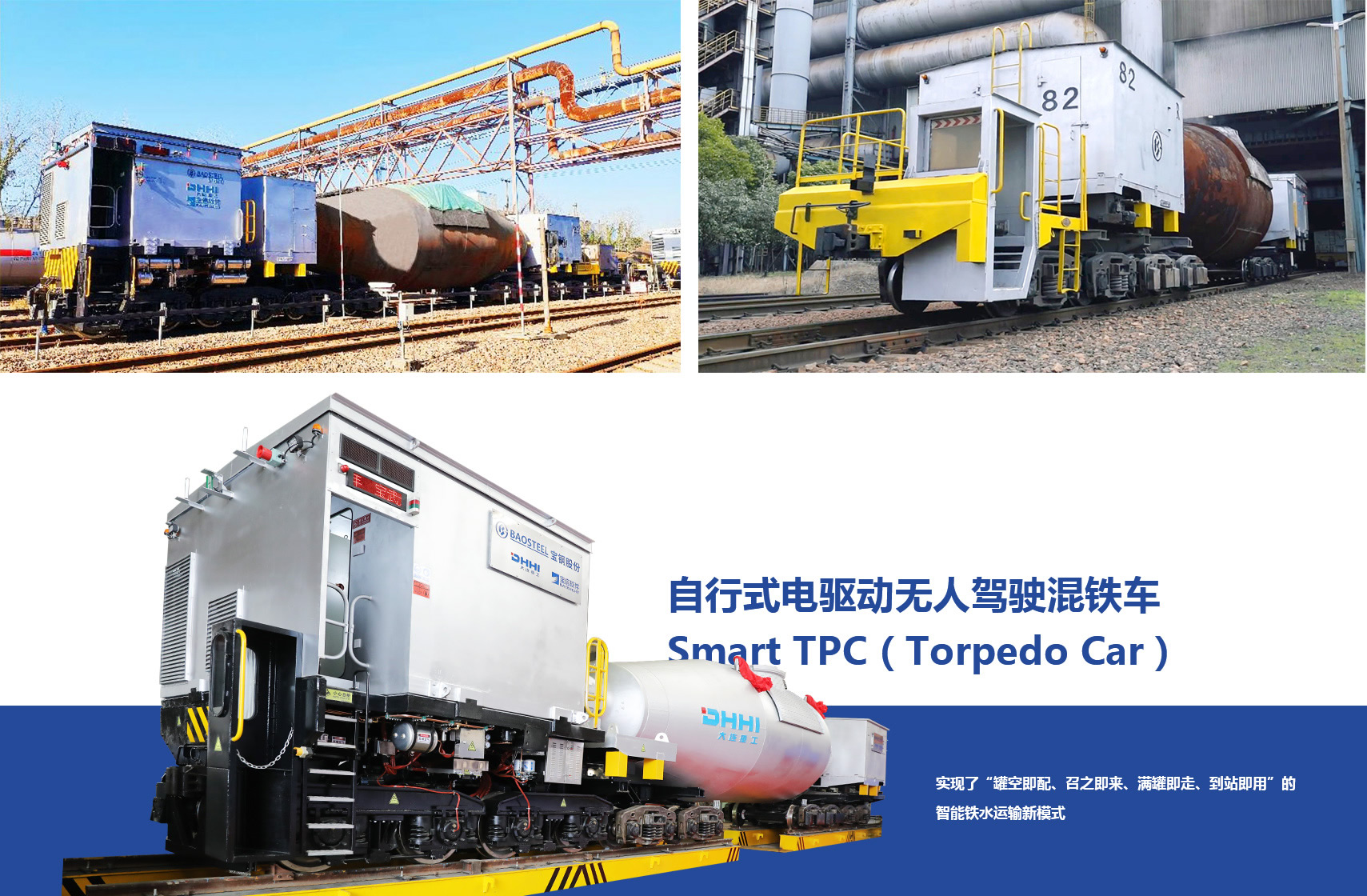自行式電驅(qū)動(dòng)無人駕駛混鐵車Smart TPC(Torpedo Car)是一種綠色、智能、高效的鐵水運(yùn)輸設(shè)備,采用自動(dòng)駕駛,純電力驅(qū)動(dòng),實(shí)現(xiàn)了“罐空即配、召之即來、滿罐即走、到站即用”的智能鐵水運(yùn)輸新模式,可智能、綠色、高效地完成從高爐到煉鋼的鐵水運(yùn)輸作業(yè)。